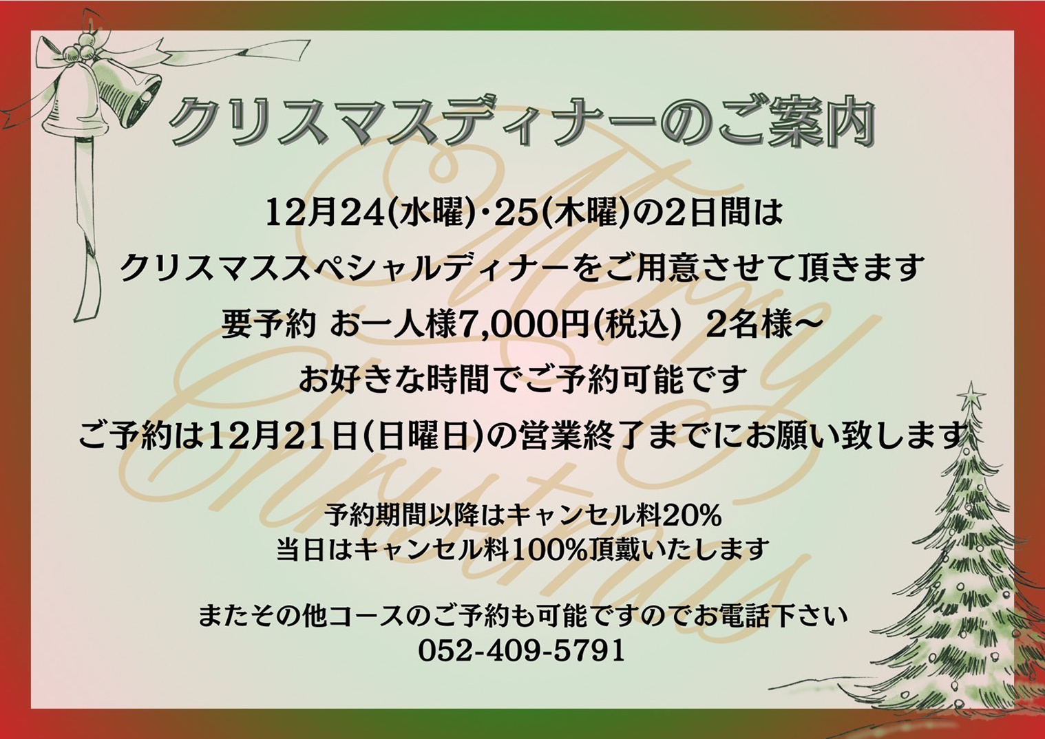 | 定休日 | 月曜日、火・木曜日夜の部(月曜日が祝日の場合は火曜日) ※詳しくはInstagramにてご確認ください。 |